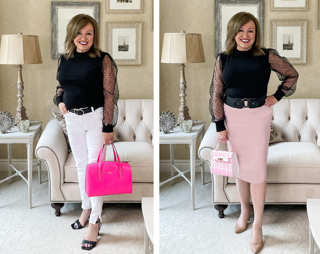 Looking for our updated looks for the Mesh Sleeve Blouse? Click the button below see these looks!