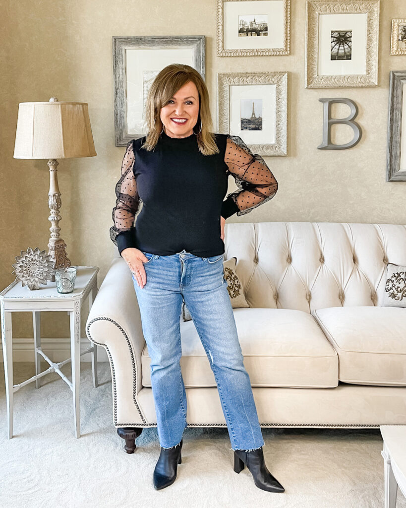 It seems there are always articles written about this. Should you wear distressed jeans over 50? What I’ve read and what I personally agree with is yes, but with caution. I like to wear distressed jeans with just a little bit of distress. It makes me feel “on trend” without going overboard. Of course, I do believe that you can wear whatever you want. So, if you want to wear full-on distressed jeans, then go for it!