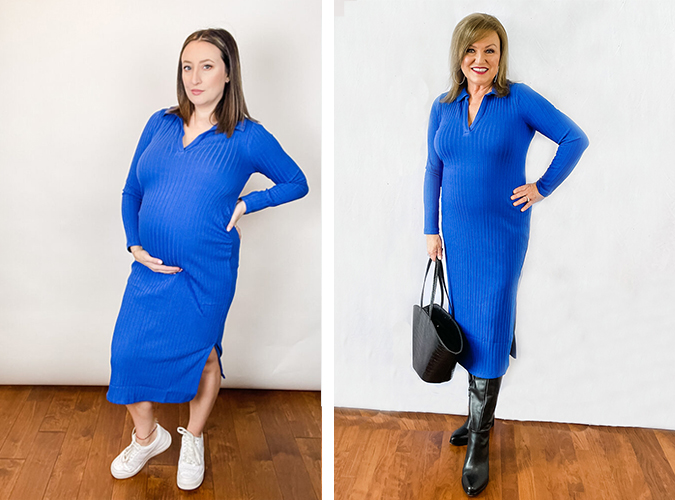 For “How to Wear it at Any Age” Volume 18, we’re starting out with a perfect dress from Old Navy. Why is it perfect? Because the same dress comes in both “regular” and maternity sizes. and that makes it perfect…