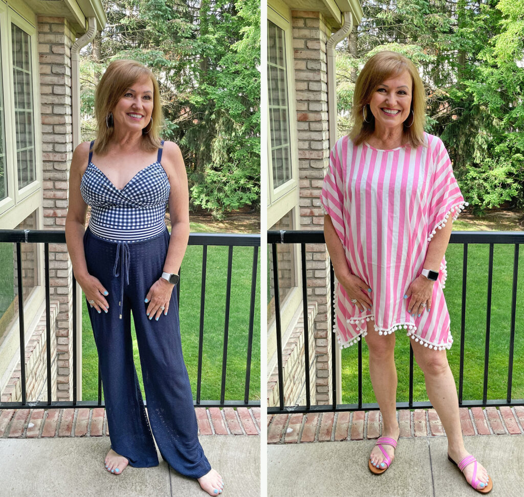 The cover-up I am wearing in the picture at the top of the post is the first one in the second carousel below. The first two cover ups are matches to two of the suits above – the Ralph Lauren print tankini and the Skimms high neck one-piece. In the picture right above, my mesh pants are from Kohl’s and my pink and white stripe cover up is from Viv & Lou.