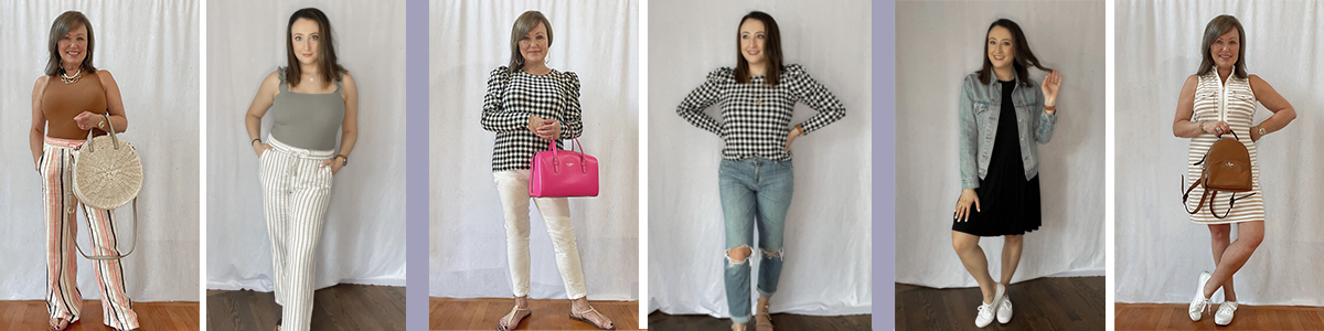 We both decide on three items that we want to style. Two of them are items we’re comfortable with and one is just a little outside of our usual comfort zone or new to us. For this round, it’s the gingham shirt with the puffy sleeves. We do not share how we were going to style each one, so that we can’t influence each other. You’ll see from the results below that in some ways we are alike and some ways we are different. But we hope in all cases we give you some style inspiration, no matter what your age or life stage! (Please note: As an Amazon Associate, we earn from qualifying purchases.)